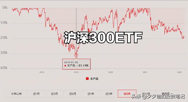 (1)宽基指数:我们先来看大盘指数的回撤。以华夏沪深300ETF为例,近五年平均年化收益率为7.88%,,近五年最大回撤为-31.14%。如下图所示: