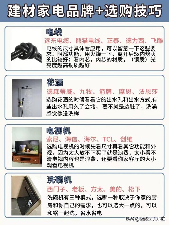 下面是20种建材家电品牌+选购技巧关于冰箱、浴室柜、智能马桶、水龙头、橱柜、地板、木门、开关插座、风扇、壁纸、地漏、乳胶漆、五金、灯具、瓷砖、水槽、电视、花洒、电线、洗碗机、门窗、石膏线、防水涂料、美容剂。让我们一起来看看它们。#装修避坑团队#