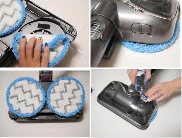 一个吸口可以先帮你吸灰尘。出水量可以控制,有三级出水量可以调节。使用的清洁布质量好,吸尘不脱毛,更换清洁胶粘固定非常方便。