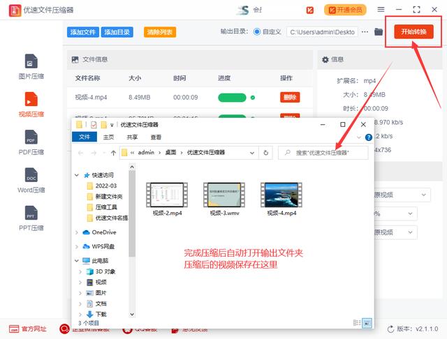 第三步:设置完成后点击【开始转换】红色按钮,启动压缩程序。压缩完成后,软件会自动打开输出文件夹,所有压缩后的视频文件都保存在这里。