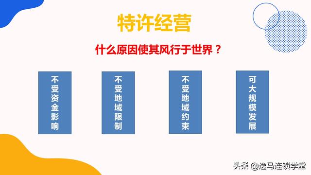 很多人好奇是什么让特许经营风靡全球,甚至成为各国跨国连锁的主要形式。探究原因:主要是因为特许经营是经营技能和经营形式的许可,也是知识产权的授予。不受资金、地域、时间等诸多因素的限制。,并且可以同时发展多家连锁店,不需要像正规连锁店一样从总部投资开店。由于特许经营的本质是一种软件技术转让,也是一种无形资产转让,不受硬件设备的束缚,所以在任何有消费群体的地区都可以大规模发展。