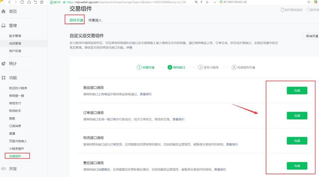 第一步:商家到微信小程序后台,在“功能”菜单中找到交易组件,申请自定义交易组件。