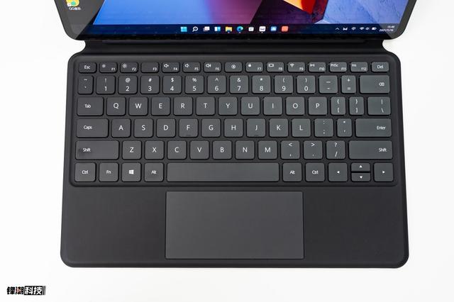 先说华为MateBook E配备的智能磁力键盘,这款键盘的键程适中,打字手感舒适。它采用亲肤材质,手感非常棒,在天气较冷的情况下使用也不会有被冻住的感觉。键盘上的触控板足够大,手感也不错,没有廉价笔记本的懈怠感。触控面板配有NFC识别区,方便使用华为手机的用户启动多屏协作等操作。