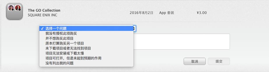 3选择退款原因。在这里,苹果提供了几个选项,比如“我没有授权这次购买”、“不像是买了这个物品”、“本来打算买另一个物品”、“物品没有下载或者找不到”、“物品可以打开,但是没有起到预期的作用”、“我的问题没有列出来”。选择后,描述问题并单击提交。