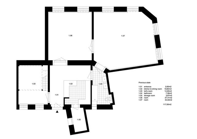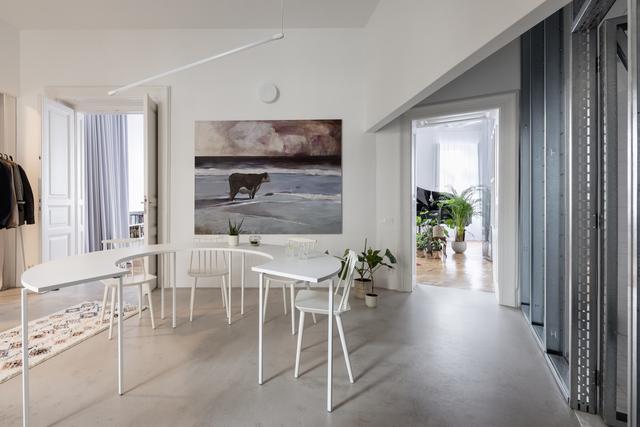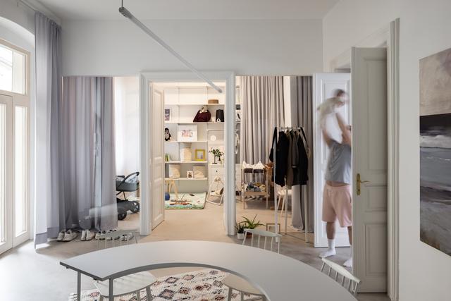 我们的目的是创造一种氛围,而不是一个严格预定义的空房间。公寓是从为居民服务的私人庭院进入的。迎接你的将是一个带厨房的大餐厅,位于前储物间的原址,略微向餐厅延伸。左边可以通过嵌有透明隔断的老门进入儿童房。