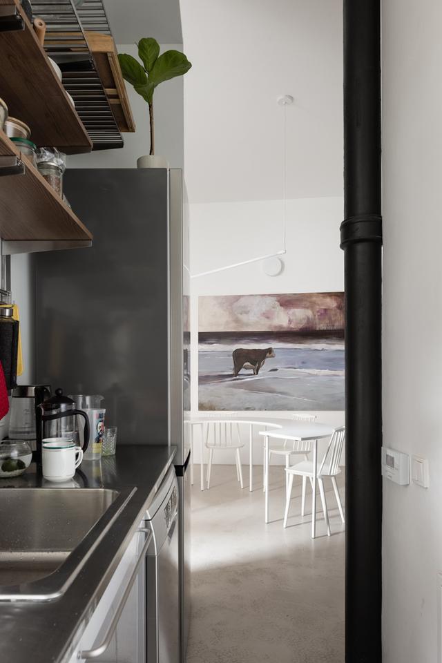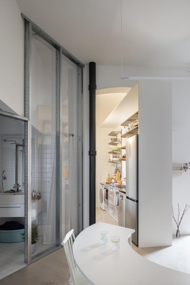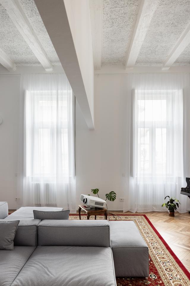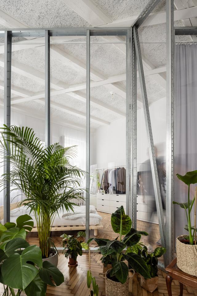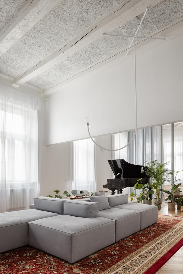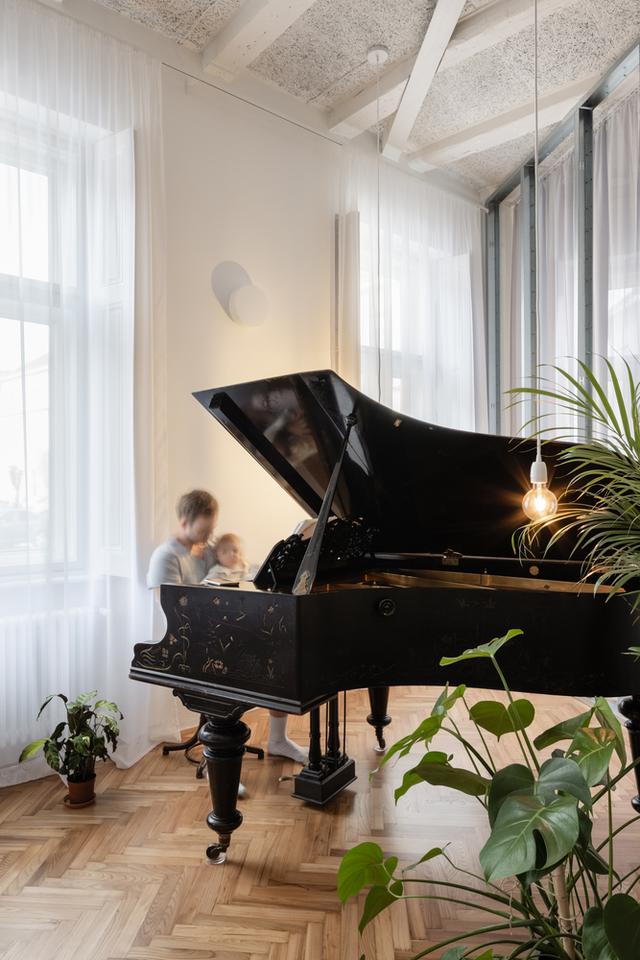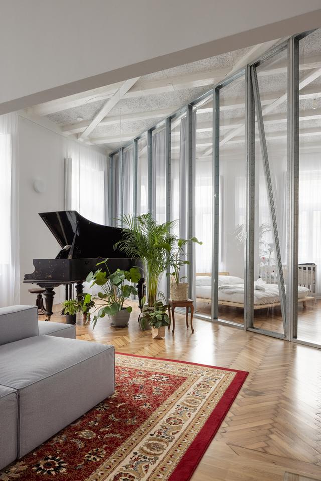 在右边,你会看到一个长而透明的隔板,它定义了浴室,然后继续延伸到公寓的第二个一楼,在那里它将卧室与一个大客厅隔开,客厅有三角钢琴、室内花园、电影放映和烤箱。我们喜欢我们在公寓里创造的空深度。我们喜欢有机会看透更多空层。在公寓有客厅的部分,我们设法揭开了原来的木梁天花板,除了钢筋。一个有着近120年历史的年轻家庭的灵活开放的家。