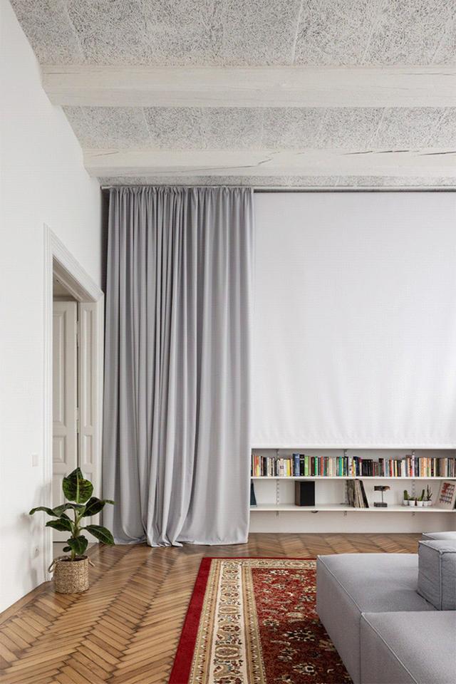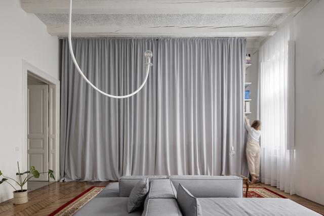 公寓里空的定义很简单。有了窗帘的透明隔断,你可以感受和享受整体的纵深空,但同时,如果有必要,也可以提供足够的亲密感。家具定义了最重要和最必要的东西。
