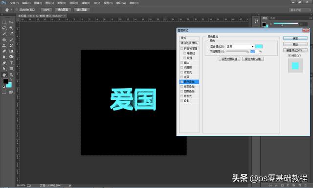 6.然后我们打开原来图层的小眼睛,移动到图层的最上面(如果文字不是很均匀,可以按Ctrl+T自由改变和调整位置),用蓝色填充。然后我们点击复制图层,双击复制图层,会弹出一个图层样式面板,选择颜色叠加,把颜色改成和我们填充的文字颜色一样。准备就绪后,单击“确定”完成!