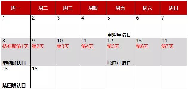 5日,也就是某个周五,基金申购时是T+1日确认的,所以直到下一个交易日,也就是下周一,申购确认日也是持有期的第一天,当你周五申请赎回时,下一个周一(也就是15日)是赎回确认日,赎回确认日之前的自然日(也就是14日)是持有期的最后一天。通过这种方式,可以计算出