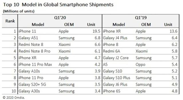 苹果这次推广的iPhone 11也是苹果的一大功臣。根据Omdia公布的数据,2020年第一季度,来自苹果的iPhone 11销量排名第一,1950万台,远远落后于机型。