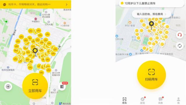 上图中的自行车共享界面,你知道哪个是小程序哪个是app吗?左图是小程序,右图是app。使用小程序几乎可以完全取代手机app。毕竟这个软件的使用功能太单一了,只能在特定的场合使用。对于用户来说,除了打开时更容易找到之外,手机APP的优势并不大。