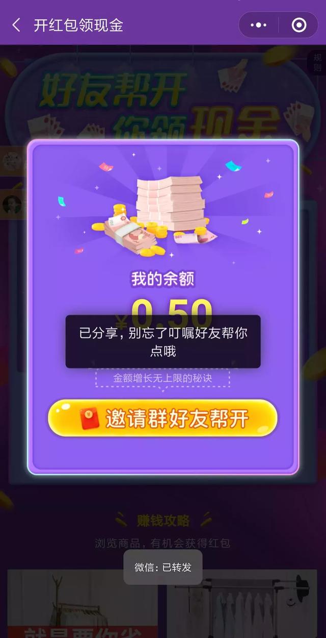 在“开红包领钱”中,用户点击“邀请群友帮忙开”分享小程序到群里后,文案会提醒用户“已分享,别忘了请好友帮忙”。