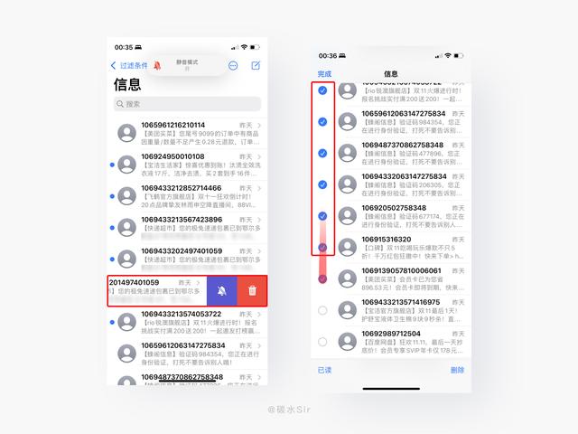 设计:在“iPhone Info”中,向左滑动删除单条消息。对于多条信息,可以通过右上角的“更多”-“选择信息”进入批量选择状态。这时候就会出现两种交互手势:一种可以点击逐个选择,适合区间信息的选择;另一个可以按下并滑下左边的“未选按钮”进行批量选择。值得注意的是,当手势滑动到标签栏时,信息列表会默认向上滑动,继续进行批量选择,然后就可以对选中的信息进行“读取”了。