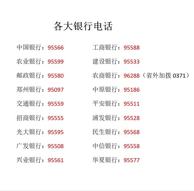 中国银行:95566 工商银行:95588 农业银行:95599建设银行:95533 邮政银行:95580 农商银行:96288(省外加拨0371)郑州银行:95097 中原银行:95186 交通银行:95559平安银行:95511 招商银行:95555 浦发银行:95528光大银行:95595 民生银行:95568 广发银行:95508中信银行:95558 兴业银行:95561 华夏银行:95577