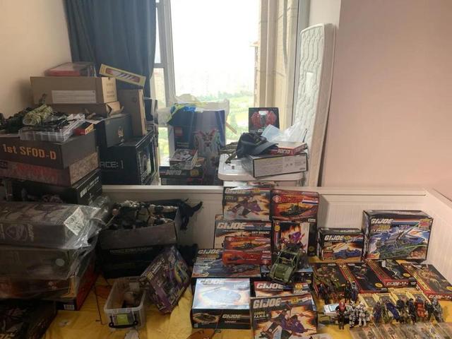 两室一厅的房子里,堆放着各种各样的玩具。一进门,记者就看到了一个6平方米左右的专属“玩具房”。一整面墙大小的展示柜里,一排排摆放着近百个玩偶;走进客厅,在2米高的玻璃展柜里,摆放着满满一柜子的高达模型。次卧旁边,一整床80年代的玩具几乎占满了整个房间。