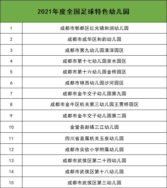 在2021年国足特色幼儿园名单中,有15个园区上榜。其中郫都区1家,成华区1家,金牛区7家,金堂县1家,青羊区2家,武侯区3家。