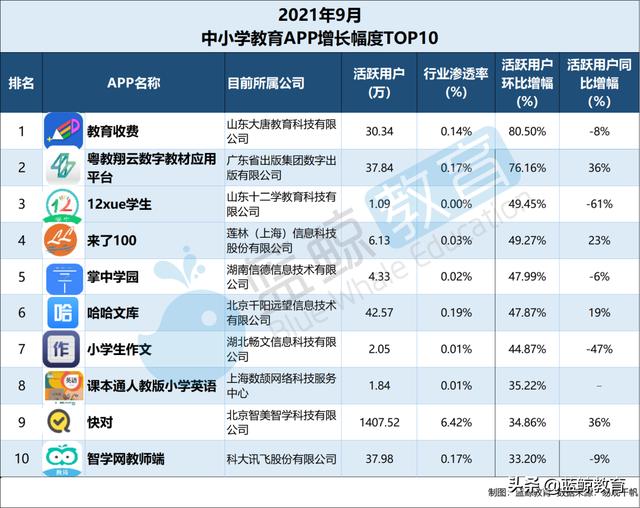 2021年9月底,用户增速排名前10位的app分别是:教育收费、粤教祥云数字教材应用平台、12学学生、来100、掌校、哈哈库、小学生作文、小学英语教材、快对、Zhixue.com老师。