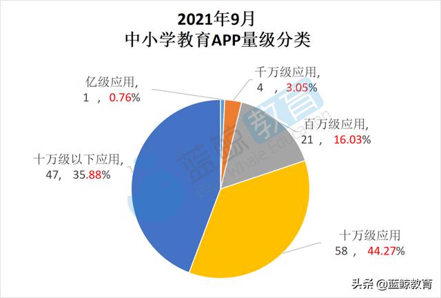 “作业帮”亿级规模应用,领域渗透率占中小学教育半壁江山,2021年9月底行业渗透率62%;4000万应用:“小猿答题”、“一起作业”、“快速结对”、“小猿口算”,其领域渗透率之和为33%;2100万用户规模app的用户渗透率与400万用户规模app的用户渗透率相等,为36%。而10万级应用和10万级以下应用的领域渗透率较低,分别为8%和1%。