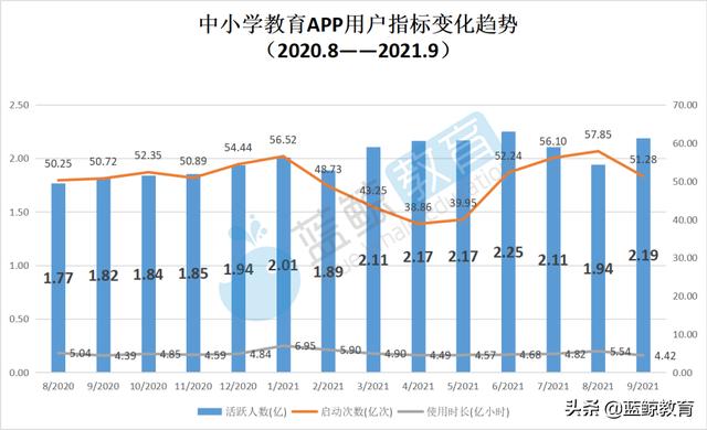 从上图可以看出,2020年第二季度中小学教育赛道活跃数一直在持续下降,下半年开始逐渐进入稳定发展期,至今处于相对稳定的波动阶段,但启动数和使用时长较去年有明显下降。2021年9月底,活跃用户21907万。与2021年8月底相比,使用时间和启动次数略有下降。使用时长环比下降20.22%,达到4.42亿小时,启动次数环比下降11.35%,达到51.28亿次。