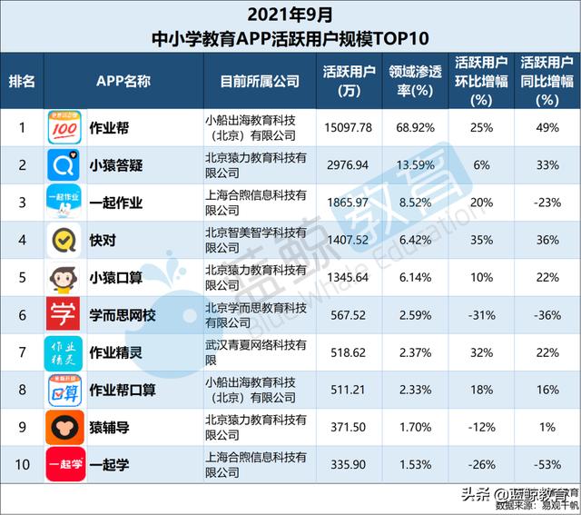 在这份榜单中,“作业帮”和“作业帮口算”属于小船出海教育科技(北京)有限公司,“小猿答题”和“小猿口算”属于北京猿教育科技有限公司,“一起作业”、“一起学习”属于上海须贺信息科技有限公司