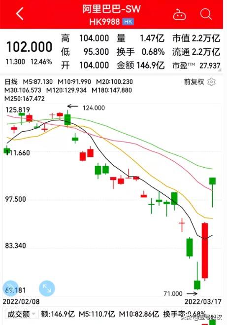 早在那天,阿里巴巴的港股价格就已经暴涨。港股价格上涨27%,收于90.7港元/股,涨幅明显小于美股。3月17日白天,港股价格再次上涨,涨幅12.5%,推动价格上涨至102港元,基本回到3月初的水平。