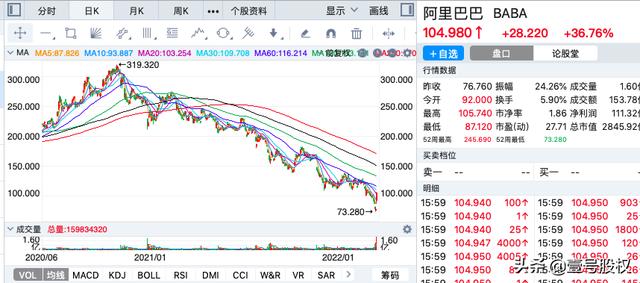 那么阿里巴巴的股价会下跌吗?虽然阿里股价获得了这么大的反弹,但从绝对值来看,目前只有105美元,还不到上个月下跌前的低点。在上个月下跌之前,阿里巴巴股价已经在110美元的底线上方波动了两个月。如果不是最近因俄乌冲突被迫退市,阿里巴巴的股价还会在这个区间。