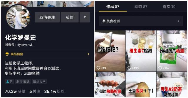 视频的形式是相对固定的,即有架空、专业设备(手套、衣服、器械等)的化学实验过程。).与Tik Tok其他大量科普账号相比,亮点在于公众关注度高的食品安全问题,如街头香肠检测(被赞25w)、泡泡茶中的珍珠成分(被赞14w)。特别注意与粉丝的互动(比如收集评价话题)。