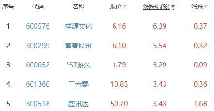 其中,祥源文化、富春股份、*ST友酒、三立60、盛迅达分别以6.39%、5.54%、5.29%、3.43%、3.43%的涨幅位列板块前五。