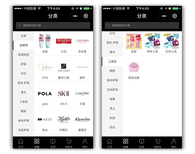 在线用户CC桃护肤和美容化妆品使用的二级分类页面。