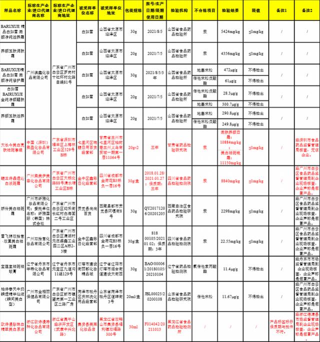 从样品名称来看,12批次不合格产品中,5批次功效涉及祛斑,4批次汞超标。经甘肃省药品检验所检验,中国(深圳)柔莹化妆品有限公司生产的一批次规格为20g×2的大长今美白亮肤祛斑套装被检出不合格。根据相关规定,汞的限量值为1mg/kg。该套装中嫩肤美容日霜汞含量为10884mg/kg,美白祛斑晚霜汞含量为11150mg/kg,均超标数万倍。经深圳美国食品药品监督管理局核实,不存在该企业。