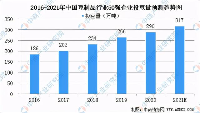 据统计,2019年中国豆制品行业50强企业投资豆类金额为266万吨,较2016年的186万吨增长43.01%,年复合增长率为12.67%。预计2021年,中国大豆行业50强企业的大豆投资将达到317万吨。