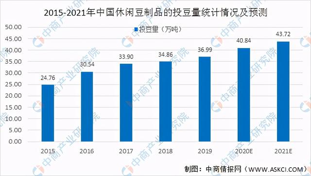 休闲豆制品是素食休闲食品。将豆腐干制成风味独特、适合休闲旅游的小包装即食食品,将豆腐等豆制品从传统菜肴拓展到休闲旅游食品。数据显示,2015年至2019年,休闲豆制品50强企业的豆类投资额从24.76万吨增长到36.99万吨,年复合增长率为10.56%。预计2021年豆类量将达到43.72万吨。