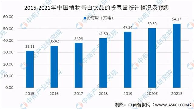 消费者越来越关注饮料的健康属性。植物蛋白饮料具有低胆固醇、低饱和脂肪、植物蛋白、健康等优点,符合健康消费的趋势,植物蛋白饮料行业取得了快速发展。2015-2019年,豆腐等生鲜豆制品50强企业的豆类投入量从35.07万吨增长到50.98万吨,年复合增长率为9.80%。预计2021年豆类量将达到54.17万吨。