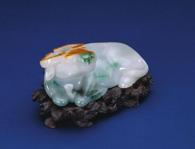 这是一件精美的清代玉器。卧牛玉微透,头、角、身一侧有暗黄色玉皮,与黄绿相映成趣,颜色极其美丽。至于摆件,它的雕工是否精美也很重要,这只卧牛的雕工非常细致,栩栩如生。在其下配以一个海水纹紫檀红木座,与玉石相得益彰。