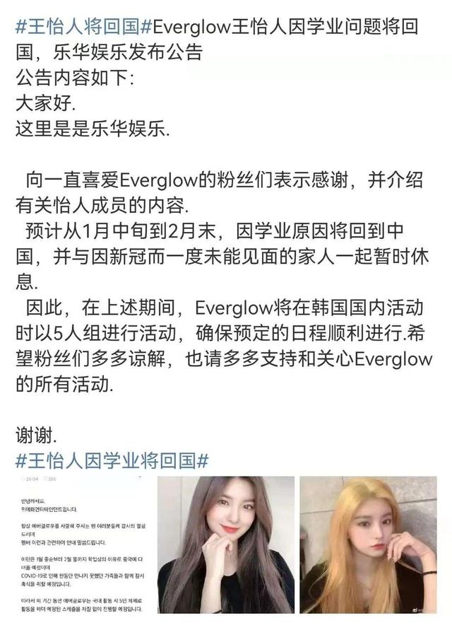 尽管王怡仁的行为在韩国引起了争议,但却得到了韩国国内网民的一致支持,其中许多人呼吁他回国发展。随后,EVERGLOW的经纪公司乐华娱乐宣布,王怡仁因学业原因即将回国,随后EVERGLOW将以五人一组进行活动。我们不知道此时选择回国是否受到了舆论的影响,但这无疑是避免争议的明智之举。