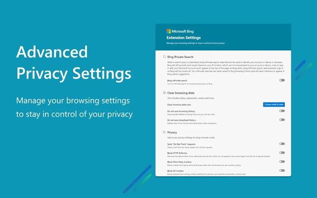 如您所料,一旦安装,该扩展将确保三件事。首先,每当你打开扩展,你的默认搜索引擎将被设置为Bing。你也将获得匿名搜索,微软账户登录被禁用,你的搜索历史在Bing.com上被忽略。最后,你可以一键访问Chrome浏览器中的其他隐私偏好设置,比如密码、历史记录、cookies等等。