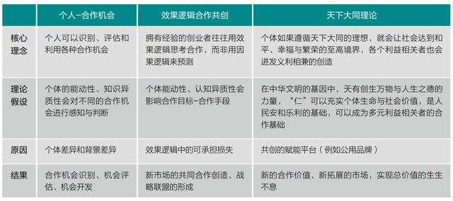 萨瓦斯的效果逻辑是一种基于个人主义的西方理论。在中国的独特国情下,我们提出了“天下大同”的理论。我们认为,世界和谐是中国文化中集体精神的永恒核心,它定义了中国的时代精神。从《易经》中的“天地大德日升”到孔子的“仁”精神,都是拓展自我、关爱他人、成就天地之道的个人美德。秉承“天下大同”的理论,社会创业的众多利益相关者可以共享“仁”的价值基准,选择和构建资源共同定义社会问题,寻找社会问题的解决方案,实现社会价值和经济价值的融合。这样,机会的共创与合作就包含了三个方面:从描述上来说,机会的共创是众多参与者在“大生活”、“广生活”的天地原则下共同定义和解决社会问题的过程;从工具性上讲,机会共创是利益相关者在“仁”的生命力下相互选择和建构以达到大德的一种方式。在规范上,“仁”是一切美德的基础,也是共创合作机会的评价标准。以“仁”为标杆,让每一个利益相关者共同实现“天人合一”的至高境界。这样,各利益相关者之间的个人经济利益和社会利益的冲突就可以很容易地得到解决。