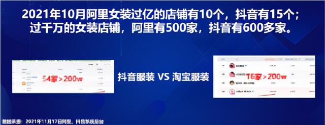 从用户角度来看,本季度中国业务新增2000万活跃用户主要是因为陶特下沉市场用户的增加。从服装店来看,2021年10月,阿里有10家店女装过亿,Tik Tok有15家。中国有1000多万家女装店,阿里有500家,Tik Tok有600多家。