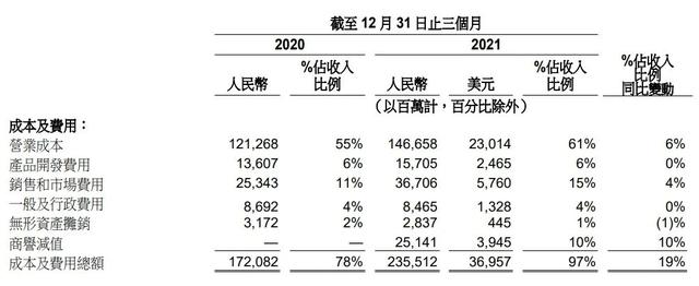 成本方面,阿里2021Q4总成本为888.54亿元,同比上涨74.9%。其中,营销费用367.06亿元,占营收的15%;R&D费用为157.05亿元,占营收的0%;管理费用84.65亿元,占营收的0%。无形资产摊销28.37亿元,占营收1%;商誉减值251.41亿元,去年同期为0,占营收的10%。