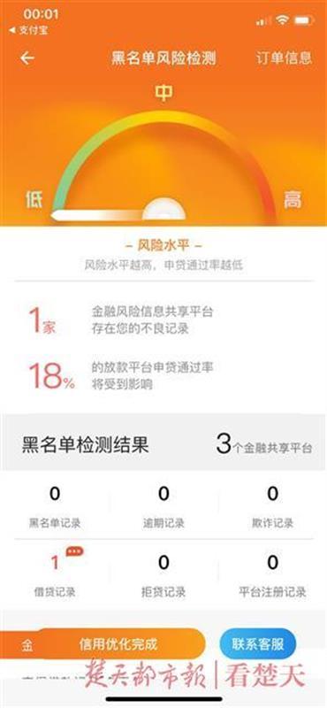 还有一个APP叫“安牛优信”。8日,记者输入自己的名字后,随意编造了一个身份证号。支付19.9元后,出现黑名单风险检测报告,提示有不良记录,18%借贷平台贷款申请通过率会受影响。