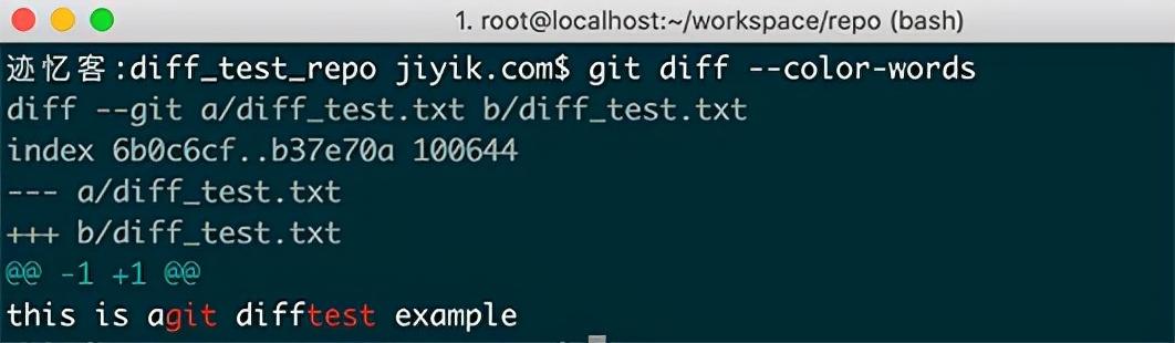 $ git diff --color-words diff --git a/diff_test.txt b/diff_test.txt index 6b0c6cf..b37e70a 100644 --- a/diff_test.txt +++ b/diff_test.txt @@ -1 +1 @@ this is agit difftest example