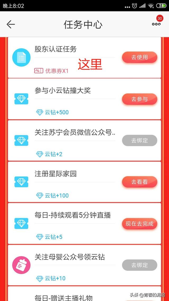 “任务中心”会找到所有可用的任务,“股东认证任务”是我们Suning.cn股东每月领取10元股东购物券的地方。