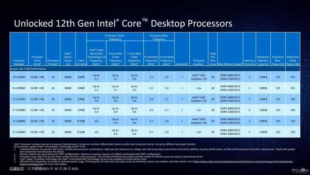 可以看出,与桌面处理器相比,英特尔在移动端的处理器减少了性能核心的数量,增加了更多的能效核心。同时,睿频的频率更低,睿频功耗大大降低,高标准核显和PCH功耗一体化。而桌面处理器在尺寸和功耗上并没有太多的限制,其性能设置会更激进,所以规范更倾向于增加性能核心和L3缓存,睿频和功耗的设置也更高。