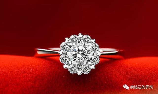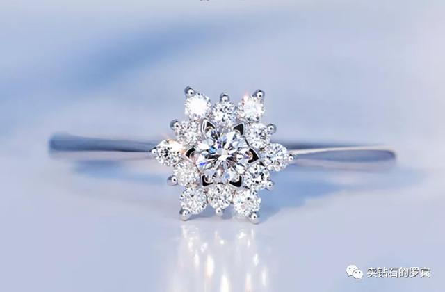 这颗雪花钻戒钻石,颜色为F-G,透明无色。切割机是最好的切割机,所以你戴上它,你真的能感受到雪花的美丽、洁白、闪耀。你怎么看?