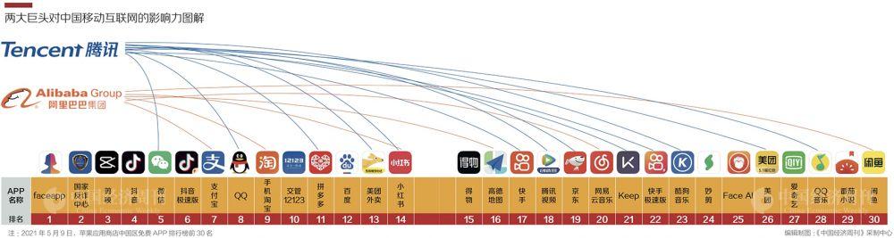 如果拿苹果App Store在中国排名前30的免费应用(2021年5月9日的数据)来观察,其中有18款与腾讯或阿里有直接或间接的资本联系,占比超过50%,可见这两大巨头对cmnet的影响力。现在巨头的资本触角已经伸到了线下。中国快递行业的“三通一达”(中通、童渊、申通、大云),加上百世快递,都接受了阿里巴巴的投资。