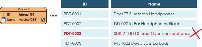 主键是一个特殊的实体属性,它唯一地定义了数据库表中的一条记录。换句话说,两个(或更多)记录不能共享相同的主键属性值。下面的ERD示例显示了具有主键属性“ID”的实体“Product”以及数据库中表记录的预览。第三条记录无效,因为另一条记录已经使用了ID & # 39PDT-0002 & # 39;的价值。