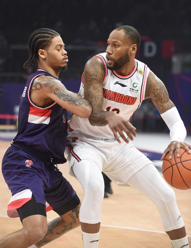 3月5日,广东东莞大邑队球员威姆斯(右)在比赛中等待突破机会。新华社记者卢摄