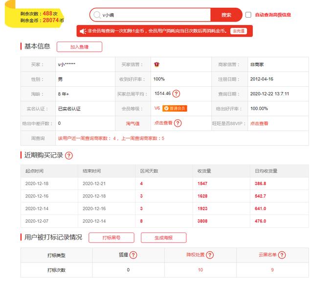 如图,基本上所有数据都有,很多工具都无法查询88vip。这是一个小亮点,周均数据可以判断平均周购物数,以及口碑和注册时间来判断是否是新号。