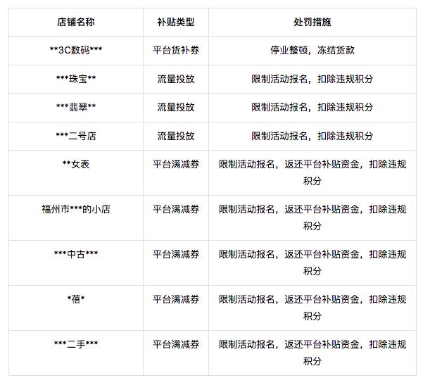 公告显示,被处罚商家骗取补贴的类型包括平台商品补货、流量交付、平台全额减免,相应的处罚措施包括“停业整顿、冻结支付”、“限制活动注册、扣除违规积分”、“限制活动注册、返还平台补贴资金、扣除违规积分”。