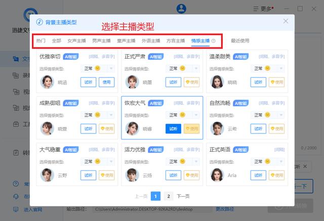 5。选择单独设置的演讲者文本,然后选择合适的锚点发音。当然,还有更现实的情感主播类型可供选择。(注意:未选中的文本由默认扬声器转换)